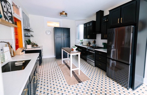 Down the hallway to your right is the spacious, fully stocked kitchen, perfect for cooking and entertaining. The kitchen features restored black cabinetry and white stone countertops for a sleek, modern look. Brand new appliances make meal prep easy. A cozy table sits by the bay windows, offering a lovely view of the patio for meals or morning coffee. In the corner, a separate cocktail bar with a sink is ready for mixing your favorite drinks.