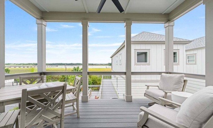 DETAILS: Winyah Bay Club features 17 stylish, individual cottage units, each ideal for large wedding parties, golf enthusiasts, and families. This cottage offers two spacious bedrooms, two and a half baths, and a master suite with breathtaking water views. The open-plan living room, kitchen, and dining area on the second floor are designed to maximize the stunning waterfront vistas, making every stay memorable and luxurious.