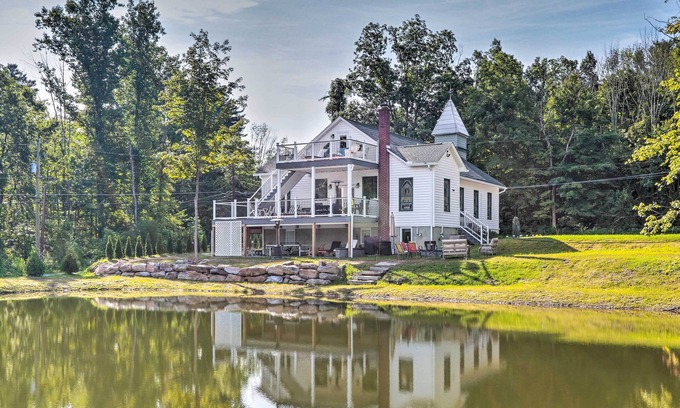 For your next Poconos lake house rental, travel back in time to this renovated 1871 Historical Country Church! This 4-bed, 6-bath vacation rental villa is a serene summer retreat where you can fish and swim, ride kayaks and canoes, and spend evenings stargazing and telling stories by the fire pit. With stained glass windows and colorful rooms, you won't believe how beautiful this Saylorsburg property is!