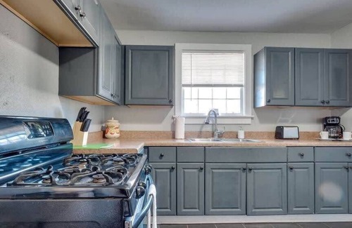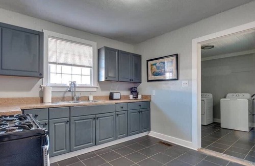 Welcome to Savannah! Guests will need to navigate a small set of stairs to enter our home through the front door. Once inside our two units, both of our living rooms are equipped with one queen sleeper sofa each and a large flat-screen TV, complete with Roku, makes the perfect place to relax after a day of adventure. The dining room is connected to both the living room and the kitchen. It has an oversized farmhouse-style table with benches and chairs. This table easily seats eight adults each comfortably. Our fully stocked kitchen has stainless steel appliances and all the essential comforts of home to help you get settled. In Unit #7, bedroom one has a king-size bed and an additional flat-screen TV with Roku. Bedroom two is generously sized with a queen-size bed. Bedroom #3 is perfect for the kids! With two twins over full bunk beds, you can comfortably sleep six kids in this room! In Unit #8, bedroom #1 has a king-sized bed with an additional queen-sized sleeper sofa. This room serves as the master suite and has its own bathroom and an additional 50" TV complete with Roku. Bedroom #2 is perfect for the kids! With two twins over full bunk beds, you can comfortably sleep 6 kids in this room! Bedroom #3 has a queen-sized bed and shares a jack-n-jill bathroom with bedroom #4 with two full-size beds. Bedroom #5 rounds out the sleeping arrangements with a king-size bed. Our home has 3 full bathrooms, a washer and dryer on-site, and a wonderful covered porch complete with a bar, lots of seating, and plenty of fun and games for all ages! While our house does have a wheel chair ramp our house is NOT ADA compliant. Guests will not have to navigate any stairs with exception to the master suite which has two steps leading down into the room. Please do not hesitate to reach out with any questions you may have about our home! We look forward to hosting you! Please note, One of the king bedrooms requires you to go down a few stairs, the rest are all on the main level! A laundry room, as well as two full bathrooms round out our comfy Savannah home. Gather your family (pets are welcome too) and start making some memories! We have a community game area with a great deal of seating and a grill. It also consists of different games such as volleyball, corn hole, ladder toss, and more! With a gorgeous view and easy access to everything that makes Savannah so charming, you will find yourself right at home in our sweet southern retreat! Please feel free to inquire about our other properties for larger groups or multiple families as part of the "Retro Rainbow." Pets welcome with an additional deposit.