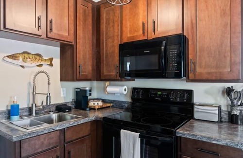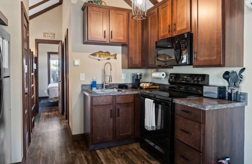 BRAND NEW tiny home located at River Rocks Landing right on the Coosa River. Are you looking for a little getaway with your family? Look no further, there’s enough room for four people in this unit and plenty of activities onsite. This unit features a queen bed in the bedroom, and bunk beds in the hallway making for a cozy living space. The kitchen is well stocked to help you with your meals, a smart TV with cable in the living space and there’s WiFi throughout the space. The light walls with dark wood gives this home a contemporary look and feel. Enjoy an evening on the porch and relax in style while gazing out at the river. Onsite you’ll have access to three pools, a children’s play area, and a game room. Stay for a weekend or the entire week, your group will have a great time in the Coosa Cottage! Parking for up to two vehicles only at each cabin, please.