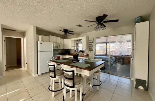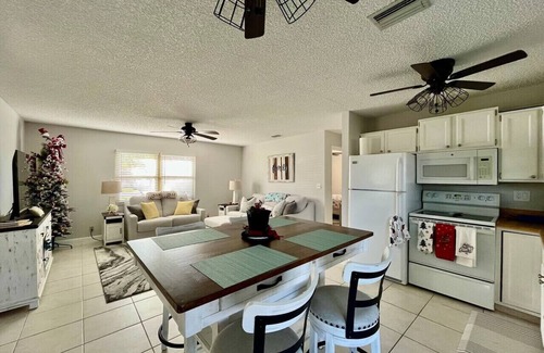 Escape to Dockside Dreams, a charming 2-bedroom, 1-bath retreat nestled on a tranquil South Florida canal. This beautifully decorated home, with its neutral tones and open floor plan, creates a welcoming and airy atmosphere perfect for relaxation.