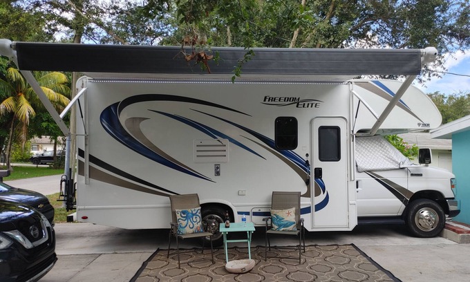 You'll be comfortable and cool in our 2019 24-foot Thor Freedom Elite RV - "Firefly" - parked in our driveway with plenty of room to park your vehicle. Firefly has air-conditioning, a full kitchen, spacious bathroom and comfy queen bed. Bring your small dog (under 40 lbs.) and your laptop -Wifi is included. Watch TV or movies on the 40" Roku. Firefly stays parked in our driveway just 4-miles from Kings Bay Navy Base and 5-miles from historic downtown St. Marys on the St. Marys River. You can put your boat in the water or take a boat tour to beautiful Cumberland Island. Have fun exploring the shops, restaurants, bars, fishing pier, and live music downtown. Easy access to I-95.