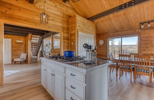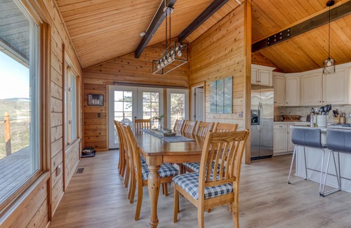 With its sweeping views of the Columbia River and Rowena Canyon, this striking four-bedroom cabin is ideal for your next family-friendly vacation. The peaceful, six-acre property is home to a variety of wildlife and is great for watching large birds of prey gliding on the cliff updrafts right in front of the house! The area is also known for its hiking, fishing, watersports, fruit farms, and wineries, and is a short drive from the shopping and restaurants of Hood River.