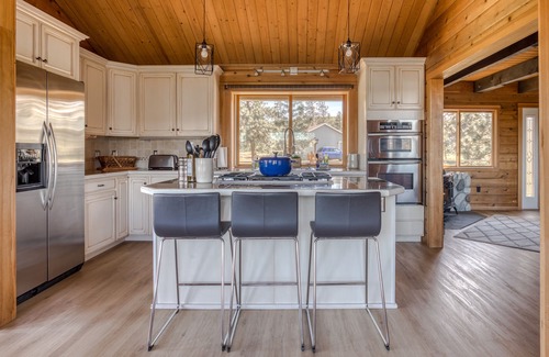 The full kitchen is the dream of any family chef, with stainless steel appliances that include a French-door refrigerator and a dishwasher, a center prep island, and lots of storage and counter space. The kids can enjoy your home-cooked meals from the three barstools and the wood dining table has seating for up to 10 guests. Outside, you'll find a fully enclosed wrap-around deck equipped with a new six-person hot tub, a large gas grill, and plenty of outdoor seating.