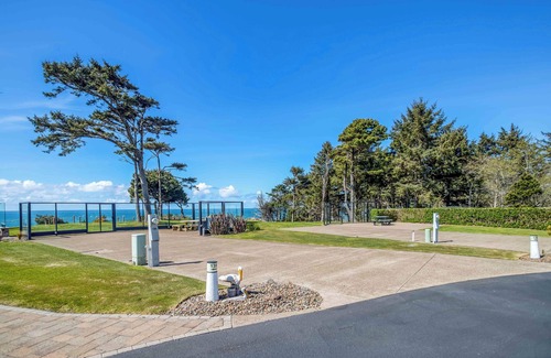 Stay a few steps away from the beach at the beautiful Pacific Shore Motorcoach Resort near Newport, Oregon.