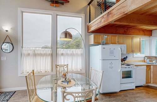 Spiral stairs lead up to the third floor loft providing even more living space and ocean views. On a clear day you can see Heceta Head Lighthouse from the North facing window. Whether playing the provided musical instruments or relaxing on the sofa watching tv, or sitting at the table playing cards, board games or puzzles, you’re sure to have a fun time with family and friends.