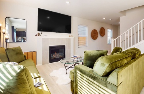 Back inside, the open-concept living room, kitchen, and dining area blend together in perfect unison. Settle down and enjoy the green velvet sofas in the living room as you warm up in front of the fireplace and stream your favorite TV shows. Cooking is a breeze amongst the adjacent full kitchen's stainless steel appliances, gleaming countertops, and center island. From here, you can easily walk into the enclosed backyard, or into the quaint children's hangout room, perfect for their afternoon reading and drawing sessions.