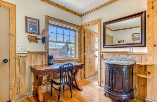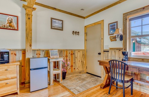 This family-friendly cabin enjoys a nice living area where the family can gather for an entertaining evening watching movies and fun shows on the TV with a DVD player. You will also discover a convenient coffee maker, mini-fridge, and microwave. The space is heated by a partial AC unit. There is a nice desk overlooking the shared courtyard should you need a space to put your laptop.