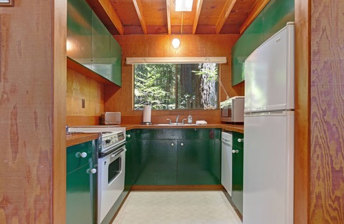 Nestled at the edge of the Redwood forest with a view of the ocean through the trees, you'll enjoy a peaceful rest in the heart of The Sea Ranch. The home has kept its character intact, with original redwood finishes and efficient cabin layout. Spend your morning sipping coffee, gazing at the blue-water ocean view and listening to the forest come alive. Start with an early morning hot tub or breakfast on the deck. Cabin 55 features a full kitchen with a dishwasher and outdoor propane grill custom outfitted for those who love to cook. The hot tub on the deck is made for two. High-speed Wi-Fi provided allows you to stream your favorite shows and movies on your laptop or the 42” Smart TV. This is the perfect place for a couple to kick back and enjoy all that The Sea Ranch, the coastal mountains and the Northern California coast have to offer. The Walk-In Cabin neighborhood is so quiet and private it only takes moments to realize all you can hear is the ocean, the wind in the redwoods, songbirds and an occasional turkey.