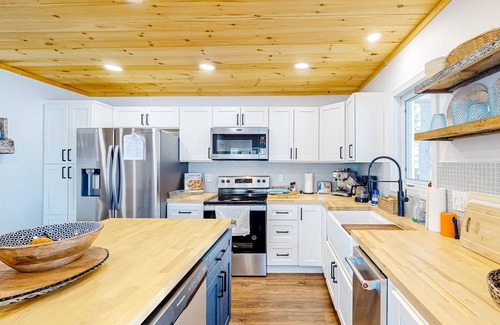 You'll have everything you need right at your fingertips for a relaxing and carefree visit, with features including a full kitchen, comfortable furnishings, and essentials like free WiFi and a private washer/dryer. A private grill is equipped for lakefront alfresco dining. A wood-burning fireplace is waiting to welcome you and your guests for cozy home gatherings in the living room. A smart TV lets you stream all your favorite shows or movies.