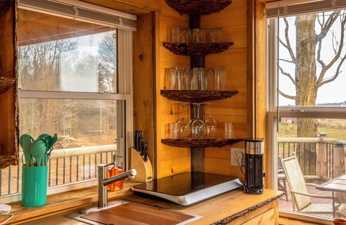 Back at home, the cozy, rustic interior surrounds you with golden, knotty wood walls and ceilings. Whip up quick breakfasts or trail snacks in your well-equipped kitchenette complete with a mini-fridge, electric cooktop, and coffee maker and then dine together or play a few board games at the nearby table for four. This home also offers complimentary internet access to keep you connected with friends and family back home.