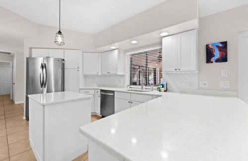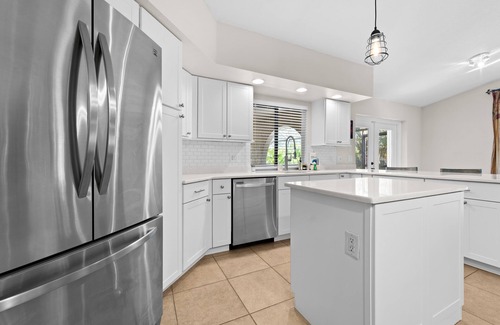 An exceptional stay awaits at this one-level waterfront Punta Gorda home! Located in a quiet, upscale neighborhood, this large home offers maximum privacy for guests with no neighbors directly across the canal. Speaking of the canal, it offers you direct access to Charlotte Harbor, which leads out to the Gulf of Mexico. The lush landscaping, including mango, key lime, banana, and avocado trees, creates a serene atmosphere. The screened-in lanai is fully furnished with a lounge seating area, a built-in bar with a sink and mini-fridge, a gas grill, and a dining table with seating for four. A swim in your private pool is the perfect way to wake up in the morning while you savor the amazing water views. Inside, you'll find a fully-equipped kitchen with stainless steel appliances, an island for prep space, and bar seating for two guests. Enjoy a snack or formal meal in the dining room that has seating for up to six people, and then head over to the living room's comfortable sectional and settle in for your favorite shows on the flatscreen TV.