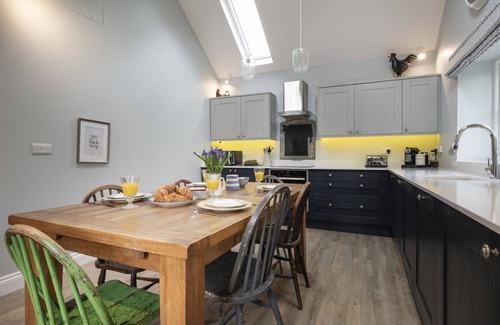 Electric oven and hob, fridge/freezer, microwave, dishwasher, Nespresso coffee machine, washing machine, tumble dryer, kettle, toaster, cafetiere and six-seater dining table