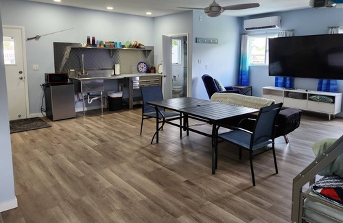 Connected to the main house is a spacious Rec Room Suite, perfect for kids, teens, or additional guests. This space includes two twin-over-full bunk beds (sleeps up to six), a full bathroom, a kitchenette with a sink, mini fridge, microwave, and dishware, and a dining table that seats six. A cozy sofa and a massive 86” Smart TV make it a great hangout spot. The Rec Room is also fully climate-controlled.
