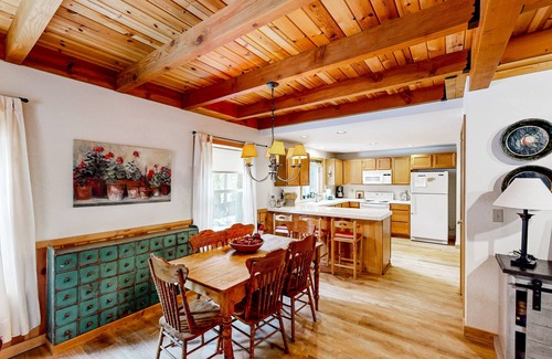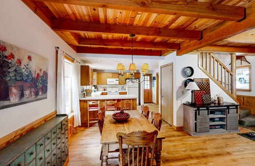 Enhancing the warm and inviting ambience of the interior are beautiful exposed ceiling beams, a stone hearth, and an open layout that makes it easy to spend time together. With amenities like a well-equipped kitchen, both a breakfast bar and a dining room table, and board games for family fun, this home has everything you need for a comfortable stay.