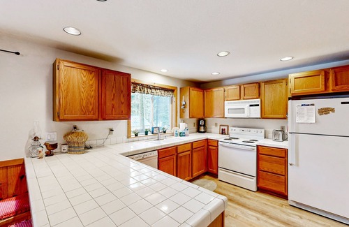 After a day of exploring the great outdoors, come home to relax and unwind among fragrant, mature evergreens. In summer, there's a side deck where you can barbecue on the gas grill and breathe in the fresh forest air. Come winter, head indoors to curl up by the wood-burning fireplace as the snow piles up outside.