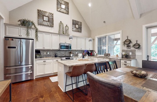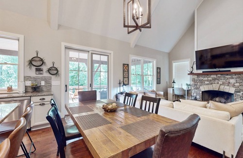 The home features a grand outdoor space with views of the surrounding nature and the soft sounds of a nearby creek all around, making it the perfect spot for a relaxing escape. Inside, a spacious living area is tastefully dressed with comfortable furniture, rustic décor, and plenty of natural light. The full kitchen boasts granite countertops, stainless steel appliances, and a center prep island. And your dinner guests will love dining in style at the handsome table with seating for six as the wood-burning fireplace keeps the party toasty. Got a little work to do during your stay? This home's high-speed WiFi makes it easy to get your remote projects completed on time. And with furniture surrounding the outdoor firepit, you can roast marshmallows before kicking back to enjoy a quiet evening of stargazing with the little ones.