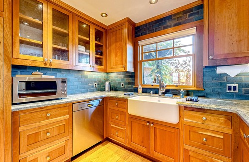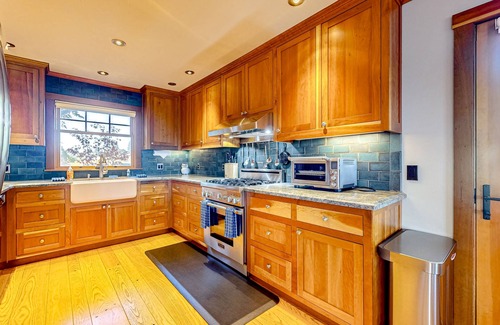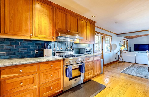All throughout the house, you'll find gorgeous elements of natural wood, with large windows and glass doors bringing in the spectacular setting. Enjoy an elegant kitchen, a country dining table, and an open living room where you can read, play board games, and stream movies in the warmth of a wood-burning fireplace. Bonus features of the house include serene bedrooms with high-end Purple mattresses and pillows providing deeply restorative sleep, matched with full bathrooms. A private laundry room and complimentary WiFi offer additional convenience during your stay.