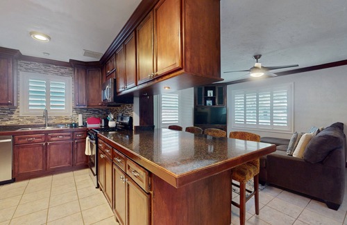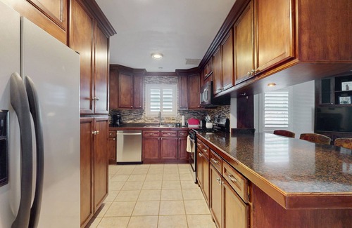 Inside, a spacious kitchen boasts stainless steel appliances and ample counter space to prepare meals. Four can perch at the kitchen bar. After dinner, stretch out on the sectional and stream a movie on the flatscreen TV. A large desk with a chair creates a comfortable space to work from home.