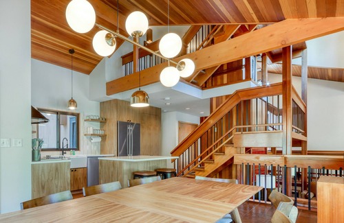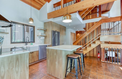 Climb a flight of stairs to reach the main living area of the home, which features a sunny living room, dining area, and well-equipped kitchen. The space has unique arquitectural elements that make this home stand out from the rest - vaulted ceilings, exposed wood beams, carpeted and tiled floors throughout, and beautiful stairs. The living room makes for a great conversation area with comfortable seating. From here, you can access a spacious balcony overlooking the trees. The luxury kitchen is all about stainless steel appliances, including a double-door fridge, dishwasher, stove, oven, coffee maker, and a sparkling center island. The dining area offers direct access to a well-appointed deck, furnished with a dining table, a firepit, and a propane grill for warm-weather barbecues.