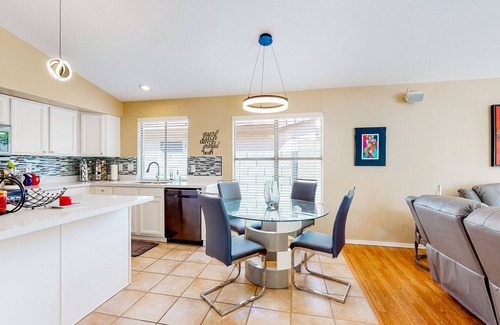 Upon entering, you will be greeted with colorful decor, warm tones, and a glimpse of your backyard oasis. Spend most of your time outside soaking up the sunshine in true relaxation mode by the sparkling pool (please note, the pool is not heated), grilling a bite to eat, hanging out around the firepit, or partaking in a game of cornhole. Inside, there is ample room for everyone to enjoy their stay and be able to "get away" at the end of the day. The main living area enjoys plenty of comfy sofas and a smart TV to keep you entertained during your stay. Curl up on your favorite sofa and stream your favorite movies and shows, or challenge your best friend to a round of chess. The wood-burning fireplace will keep you nice and toasty if you are visiting during the winter months.