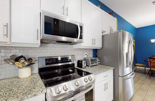 Take daily dips in the pool, and sit down with a good book or a great meal in cushioned backyard seating in both sun and shade. Inside, you'll have a washer/dryer for your swimsuits, central air conditioning to keep you cool, and a colorful, open floor plan for easy gathering. The modern kitchen features stainless steel appliances (including a dual oven and a built-in microwave) and such bonus features as two coffee makers and an ice maker. Enjoy smart TVs in the living room and both bedrooms, two bathrooms (each with a bidet) to pair with the two bedrooms, and high-speed WiFi throughout the house.