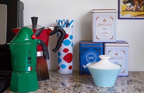 Colorful, sun-filled, and beautifully-decorated two-story house with large, fenced-in yard right off Broadway in the Midtown Arts District of Kingston. This clean, uncluttered two-bedroom oozes good vibes and easy living, with nice views out the windows, healthy plants, and inspiring art. Great for couples or a small family/friend group, and outfitted for up to 2 dog guests to have a safe, pleasant stay. Equipped with a large cook's kitchen and everything you need to make or serve a great meal (a Weber charcoal BBQ grill is available in the warm months). Central heat and AC, Wifi, a dedicated office area, a dishwasher, a washer/dryer, and private parking round out the conveniences of a great home base. There's a full bath with a bathtub and shower on the ground floor, and a half bath on the second floor, where both sleeping areas are.