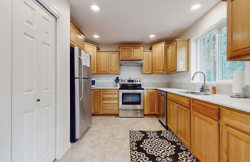 Send the kids (and the family dogs) out to collect kindling from the forested sections of the property, then light up a fire in the wood-burning stove to keep everyone toasty. Gaze out over Lavender Lake and the mountains, or switch on the living room TV and make snacks in the full kitchen for the ultimate game day! Outside, fire up the gas grill and gather around the picnic table for the perfect summertime cookout, then take the three kayaks out onto the lake and relax on the water. You can also light a fire out in the firepit for fun times together under the stars.
