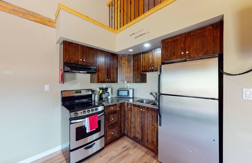 Find serenity at this Lac Le Jeune Wilderness Resort cabin. Just minutes from its namesake lake, this waterfront property showcases scenic year-round beauty in the heart of British Columbia. Blending rustic charm and contemporary comfort, this classic log cabin features a one-bedroom-plus-loft layout with all the essentials of home including a full kitchen, baseboard heating, and complimentary internet access. Enjoy the outdoors with coffee or cocktails on the private deck and after the day's adventures, unwind at home with some casual entertainment the TV. The shared on-site washer/dryer adds convenience during your stay.