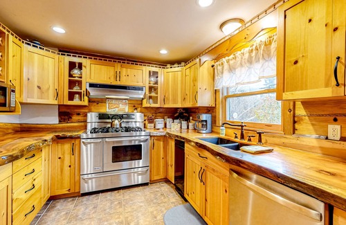 Upon your arrival, you'll be greeted by a spacious front porch - a tranquil, covered space to sip your coffee in the mornings and watch for deer making their way through the glen. Just inside, the living space encompasses 1,700 square feet of natural wood elements and such thoughtful touches as radiant floor heating. The ambience is classic and rustic, but there's modern comfort at every turn. Prepare meals using stainless steel appliances in the custom kitchen, play board games around the coffee table, and watch movies (on DVD and streaming services) as the woodstove crackles in the background. This house offers multiple levels, including a loft area for additional sleeping space. With amenities like a firepit, deck, and gas grill, you can relax and unwind while taking in the serene surroundings.