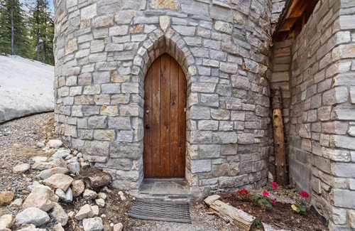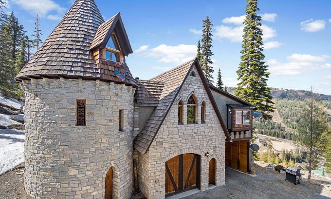 This true living stone castle presents three levels of otherworldly comforts with a blend of modern amenities and old-world features like hand-laid stones, statues, and curved staircases. The dramatic great hall boasts a vaulted ceiling, hydronic-heat floors of Idaho Quartzite, a cozy living area with a 50' wood-burning fireplace, a well-equipped, kitchenette with colorful stained glass windows, and a grand dining table ready for hearty banquets or memorable game nights. This home also includes a private hot tub room with breathtaking mountain views. Whether you're here for the ultimate ski-cation, a newlywed getaway, or a family adventure, let The Castle - Chateau De Melusine transport you and your guests into your world of fantasy. Hotel rooms are soon forgotten, and memories last a lifetime!