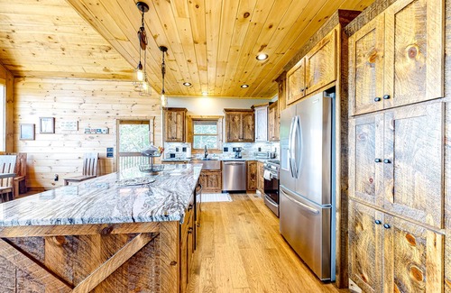 Upon entering this marvelous home away from home, you will discover a spacious open floor plan with high vaulted ceilings, exposed wood beams, wall-to-wall and floor-to-ceiling windows flooding the space with natural light and spectacular views, with rustic accents throughout. Invite your family and friends to unwind and relax in the welcoming living room, furnished with comfy sofas - the stone floor-to-ceiling gas fireplace will keep you nice and toasty during your stay. Curl up on the sofa and watch an entertaining TV show or start planning your next adventures. The gorgeous chef's kitchen enjoys an open layout, beautiful wooden cabinets, and modern, stainless steel appliances that will make cooking a breeze. This level offers an extensive wrap-around deck, providing a great spot to enjoy the outdoors while still being at home. This deck boasts plenty of seating options, tree-lined mountain views, a gas grill, and an inviting seating area in front of a majestic wood-burning fireplace. A laundry area inside a full bathroom can be found on this level as well.