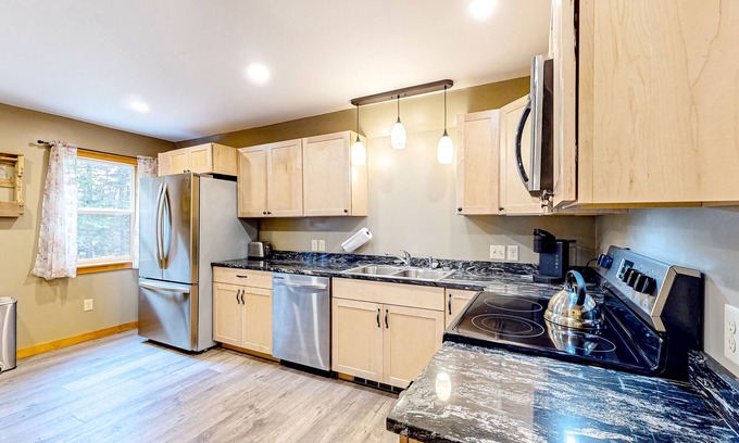 Newly constructed in 2021, the apartment is full of the comforts of home. Wood-paneled walls, windows framing the treetops, and a cozy electric fireplace bring warmth and atmosphere into the space. Enjoy a well-equipped kitchen with stainless steel appliances, an eat-in dining table for homemade dinners and board games afterward, and a living room where you can stream movies late into the evenings.