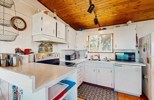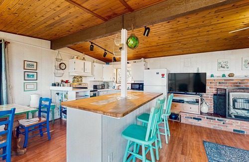 This pretty Yachats vacation rental is surrounded by the ocean on all sides, making it a relaxing rental for up to seven people and two dogs (though a nightly fee per dog and minimum fee per stay will apply). Including classic amenities like WiFi, a DVD player, and cable, this little beach cabin is a real ocean pearl.