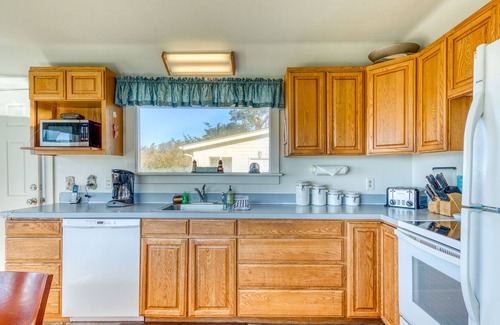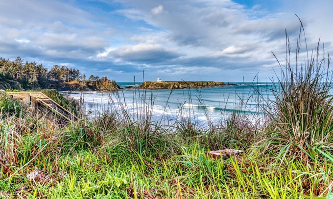 This single-level, bluffside home on the Southern Oregon Coast features private beach access, a furnished patio, incredible ocean and lighthouse views, and plenty of space for up to six guests plus the family dogs.