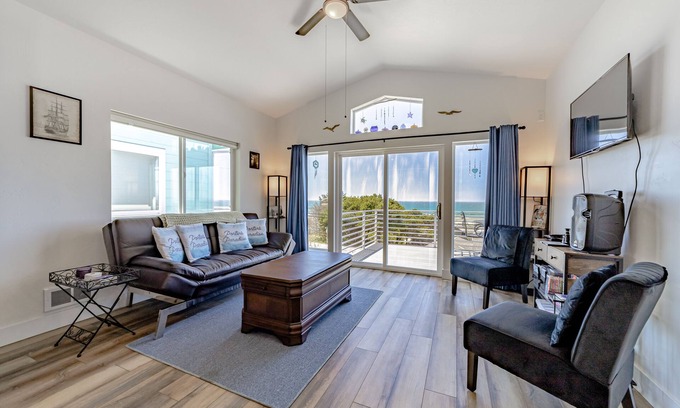 This is a newly built home with beach access right across the highway and amazing ocean views from a large and comfortable deck! Inside, the home enjoys an open concept that includes the living and kitchen areas, so you can keep up on conversation, no matter what room you're in. Spend your days on the beach then come back to spread out in the living room to stream a good movie or show on the wall-mounted flatscreen TV. You'll love using the stainless steel appliances and counter space of the full kitchen to prepare your favorite meals to enjoy at the breakfast bar with seating for three or outside on the deck as an alfresco meal. Use the private gas grill to host a fun summer barbecue with friends. The free WiFi will make it easy to keep your devices connected and with the private washer and dryer, you can even pack light for your trip! Nearby you'll find the Coastal Market, where you can shop for gourmet ingredients and coffee to enjoy out on the deck. There are lots of fun things to explore at places like Gold Beach Books & Art Gallery, Humbug Mountain State Park, Battle Rock Wayside Park, and Jedediah Smith Redwoods State Park, all less than an hour away. When it's time to call it a night, you'll have two well-appointed bedrooms to take advantage of, the primary room with a king-size bed, and the guest room with a queen.