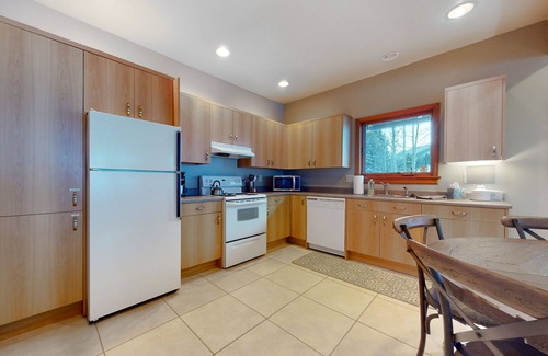 The interior is exceptionally well-lit, with large picture windows framing beautiful views of the mountains and evergreens. Shed your outdoor gear in the entry hall and enjoy an open living space that brings together a well-equipped kitchen, a dining area, and a family room with a cozy sectional and a smart TV. In-floor radiant heat and complimentary WiFi are provided as well.