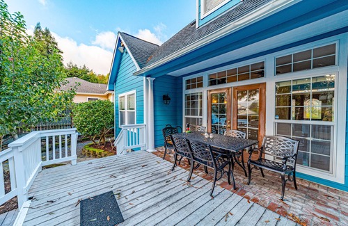The house features high ceilings that give it a fresh and open feeling. The living areas, kitchen, and dining spaces are very well appointed with all new fixtures, furniture, and appliances, providing the best getaway for a family trip or an adventure with your friends. Gather in the living area and wind down on one of the comfortable couches while planning tomorrow's adventures or playing one of the board games available for your entertainment. Back home and tired after spending the day exploring the area? Don't worry! The six-person, saltwater hot tub has your back - you can find it the garden looking at the backyard Redwood trees and is a fantastic way to end on a relaxing note. The backyard is gorgeous with outdoor seating on the deck or along the bluff overlooking the Eel River and the beautiful landscaping, with a lemon tree, fig tree, as well as blueberry bushes makes you feel right at home.