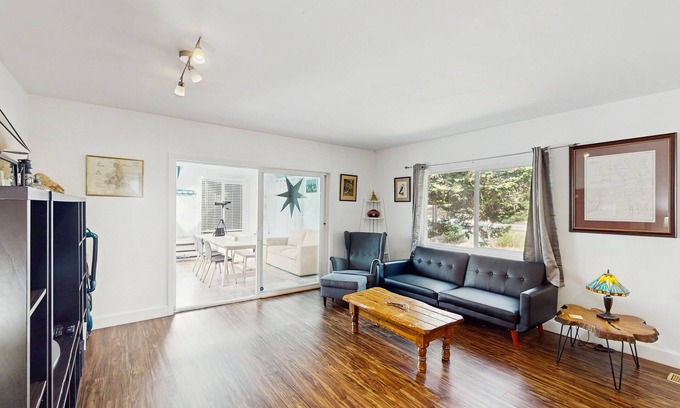 Step inside, and you will be greeted by an inviting interior filled with comfortable furnishings, natural light, and an open layout that will allow everyone to mingle from room to room as the group's chef whips up tasty recipes in the kitchen. Not to mention, the sunroom has a large dining table and sofa if you feel like simply kicking back with a good book or hosting a game night as the stars come out!