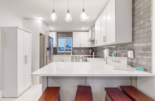 Back at home, stock up your fridge and prepare all your favorite dishes in the sparkling, well-equipped kitchen complete with a full suite of stainless steel appliances and an intimate breakfast bar. Gather around the adjacent dining table for mealtimes or rainy day board games, or head out to your covered and furnished deck and fire up the gas grill to spice up your home-cooked menu! Outside, you'll also find an outdoor seating area cooled by dual ceiling fans and a spiral staircase that leads up to a rooftop deck where you can take in the view and soak up the sunshine.