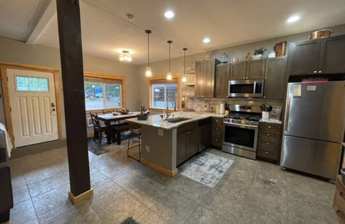 Fully fenced backyard for dogs & hot tub for 8! Cook under the covered porch on a propane grill and enjoy outdoor dining/visits in two different seating areas near the bbq. A propane tank is provided. A fire bowl, roasting sticks, lanterns, and a variety of camping chairs are available if you're interested in bringing wood for an outdoor fire (propane fire available during burn bans). In the winter we provide warming mats that melt snow right up to the hot tub, snow shovels, sleds, and 2 sets of snowshoes. In the summer grab some of our beach towels, picnic blanket, and camp chairs and head to one of the nearby lakes. We have a 15 foot 2 person sea kayak with seats and oars. Remember to bring your life jackets!