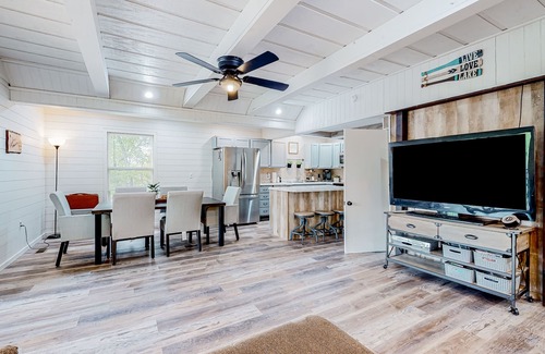 Inside your home away from home, the family room is comfortable and spacious. The water-view living room boasts a soft sofa and a large TV. The adjacent full kitchen features updated appliances, gleaming countertops, and a breakfast bar. When mealtime rolls around, dine as a family at the formal dining table, grill on the deck, and watch the sunset fall over the water from the deck's beautiful view. You can also gather around the fire pit with your loved ones for some s'mores and family time.