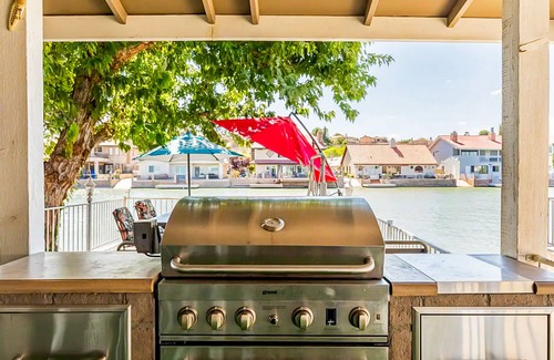 Nestled in the serene city of Victorville, this charming waterfront house offers a tranquil retreat with stunning water views! Step inside to discover an inviting interior with a nautical theme, modern amenities, and a welcoming atmosphere. The house features a sunny living room with comfortable sofas throughout, a large smart TV, and a wood-burning fireplace. For those who love to cook, the fully equipped kitchen includes a dishwasher, fridge, microwave, oven, and stove, making cooking a breeze.
