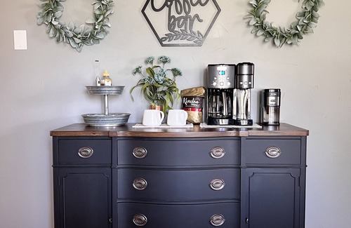 The open concept living/kitchen/dining area is the perfect place to gather. A locally made farmhouse table has seating for 8, and there’s a game table, home bar, and two of the comfiest leather sofas ever for lounging. An electric fireplace just below the large screen Smart TV provides the perfect cozy ambiance. The kitchen is well appointed and is open to the living and dining rooms. It has stainless steel appliances, a dishwasher, huge farmhouse sink, and is well stocked with cooking pots, pans, utensils, and starter spices. Begin your morning with fresh brewed coffee from the Coffee Bar! It is set up with whole bean coffee and grinder, or pods if you prefer the Keurig. Creamer and sweetener are also provided.