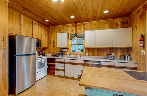 Inside, wall-to-wall windows allow you to admire lake views no matter where you are located. A gas fireplace easily warms up the entire open floor plan. Snuggle up on one of the sofas and stream a favorite series on the smart TV in the living room. The open kitchen has been equipped with all major appliances and every cookware needed to prepare the most delicious and memorable meals for the gang. The dishwasher will help you with the post-meal clean up.