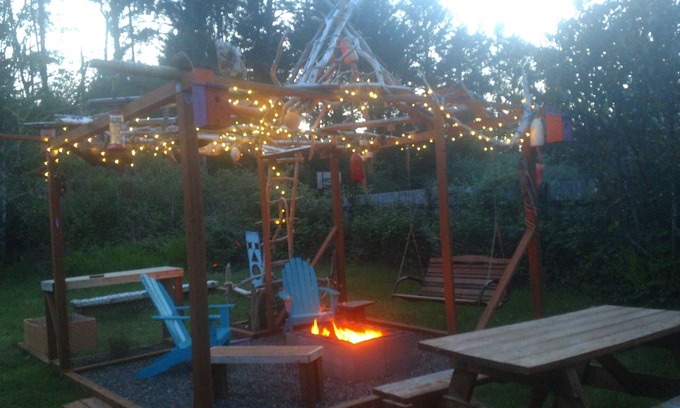 The backyard living area is private and offers a fantastic space for quality time relaxing, dining or cooking a meal on the BBQ. Take a nap in the hammock or relax on the porch swing. Have a cozy evening by the fire pit and play a game of corn hole. From the outside you can hear the fog horns and often the ocean too. The kids' area has sandbox; beanbag toss board and a fun woodsy area to explore! The woodsy outdoor setting and outdoor living space combine for a truly unique experience likely offered in few other homes in the area.
