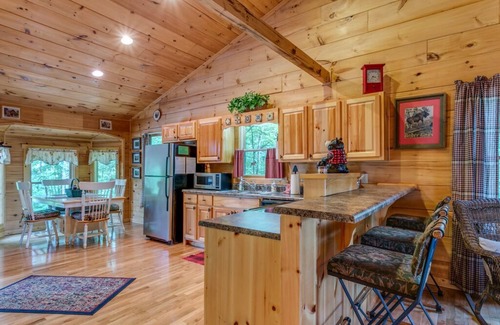 Easily accessible, conservatively priced, and constructed with a spacious one level floor plan; Dogwood Cabin really puts the best cabin amenities and mountain vacation at your fingertips. The open and airy design of Dogwood Cabin gives guests the space and cabin atmosphere they desire, but at a price point that won’t leave you feeling as though you are wasting your vacation dollars with unused space. A seasonal wood burning fireplace in the great room keeps movie nights nice and toasty, while the covered outdoor fireplace and Adirondacks just off the master bedroom looking over the wooded backyard provide the perfect backdrop to kick back with a glass of wine or good book!