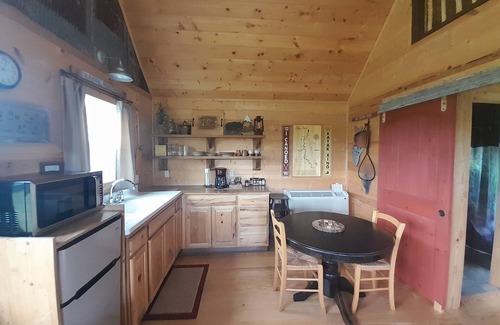 New furnishings will keep you comfortable while you enjoy the quiet, peaceful setting. Equipped with refrigerator, microwave, 2 burner electric hot plate and pans, outside grill, toaster and coffee maker! Wake up and drink your coffee in the cool mornings on the large covered porch. Cook out on the grill. Take a nature walk around the trail near the cabin. Have family time around the firepit telling stories and making s'mores. Watch the stars and satellites in the open night sky!