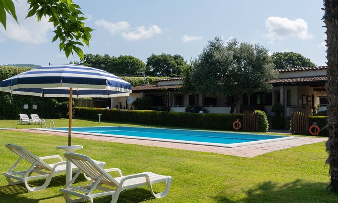 Country house "Dolce Vita". 4 houses in the residence. 9 apartments in the residence. 3 km from the centre of Bolsena, 25 km from the centre of Orvieto, 100 km from the centre of Roma, 900 m from the lake, in the countryside. For shared use: property 5'000 m2 with lawn and trees, orchard, lawn for sunbathing, swimming pool (12 x 6 m, depth 120 - 150 cm, seasonal availability: 16.May. - 10.Oct.). Outdoor shower, barbecue, children's playground. In the house: washing machine (for shared use). Roofed, parking on the premises. Shop 3 km, supermarket 4 km, bus stop 800 m, sandy beach "Lago di Bolsena" 900 m. Golf course (9 hole) 15 km. Local sale of farm products. Please note: the owner lives on the same property. Additional accommodations can be booked.